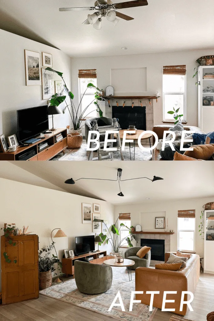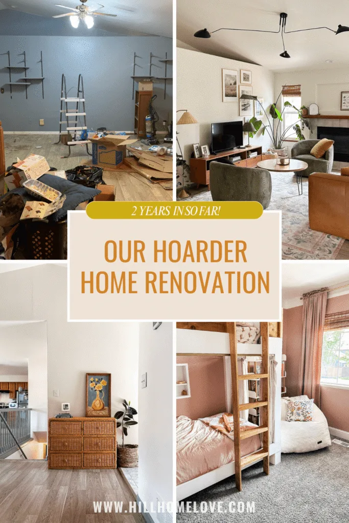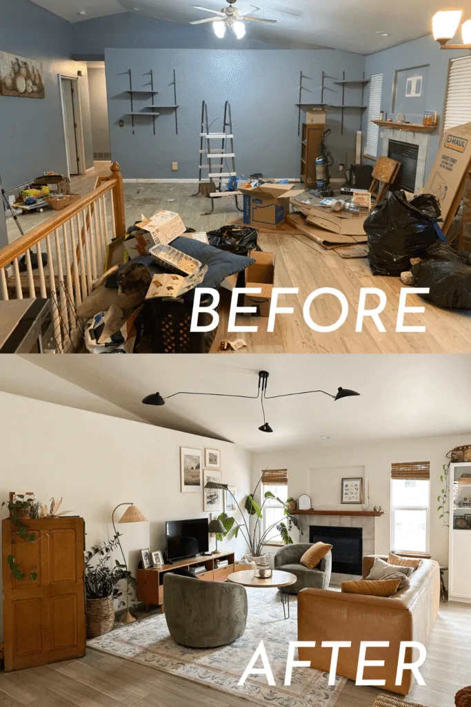 And just for fun, here’s a true before and after of our living room. This before photo came from our neighbor who helped clean up our house before it was listed and bought by us. The former owner had hoarder tendencies and the house was in rough shape. We knew it would be a fixer upper. Since we haven’t replaced the floors and trim yet, I can’t look too closely at these photos or my anxiety goes through the roof. We can’t tear these out quite yet, so I choose to live in ignorance.