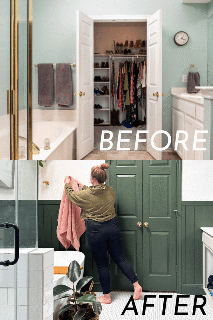 For example, I knew I wanted a dark green shiplap wall treatment in our old primary bathroom. So I chose a neutral, bright tile for the shower and floors. This way I didn’t oversaturate the room with too much color.