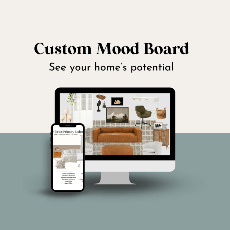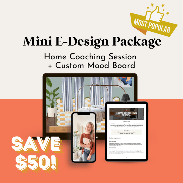 Book a Mini E-Design Package and receive both a Home Coaching Sessions and a Custom Mood Board. These services are meant for each other – like peanut butter and marshmallow fluff. (Trust me, try it.)