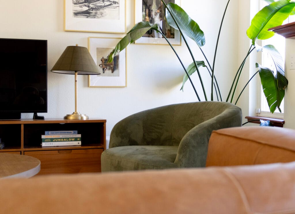 To balance out how much light brown/tan we have in our living room, I wanted colorful accent chairs. I also wanted chairs with a rounded barrel shape to compliment the couch’s boxy shape.