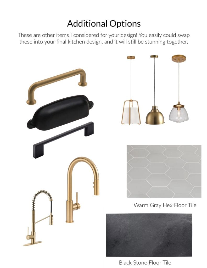 In Kathleen’s final Kitchen Remodel E-Design Package, I added a few additional options that she could choose from too. These are all elements within the style categories of her design. You could easily swap these in without altering the final design too drastically.
